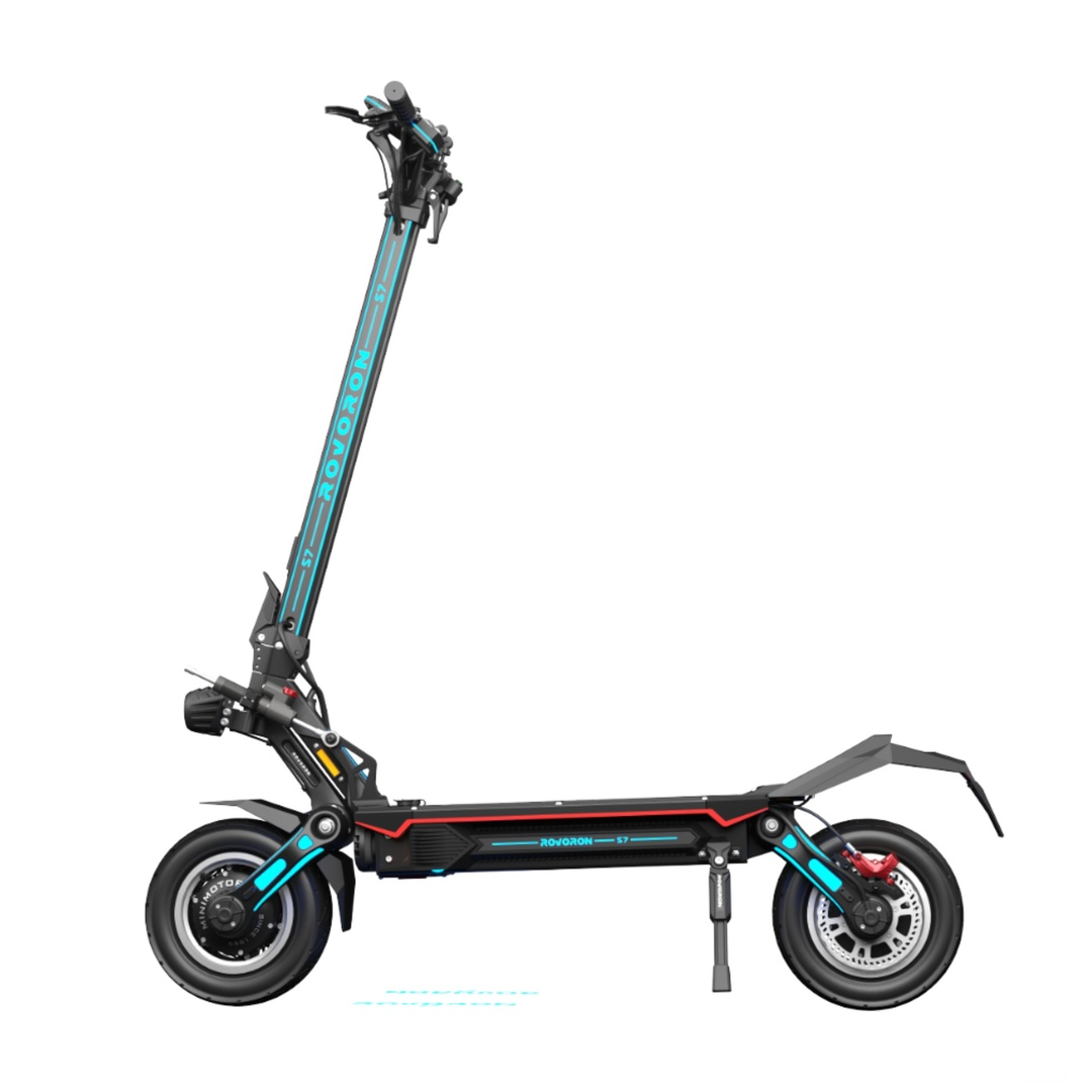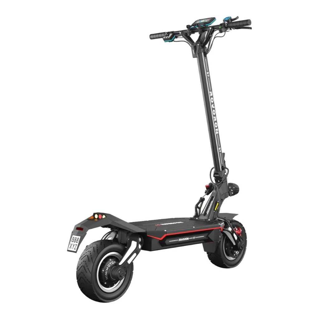 Rovoron S7. Patinete eléctrico homologado por la DGT. Equipado con potente Motor Dual 2x2500W. Este patinete eléctrico está equipado con una batería 84V 37Ah. Con esto es capaz de lograr una autonomía de hasta 140 kilómetros con una sola carga. Además de su sistema de frenado hidráulico NUTT, sumado a sus neumáticos de 11″ pulgadas anti-pinchazos. Ademas de su pantalla multifunción EY4 LCD Bluetooth, donde podrás tener el control de tu patinete eléctrico. Sin duda nos encontramos ante un patinete eléctrico de alta gama excepcional.